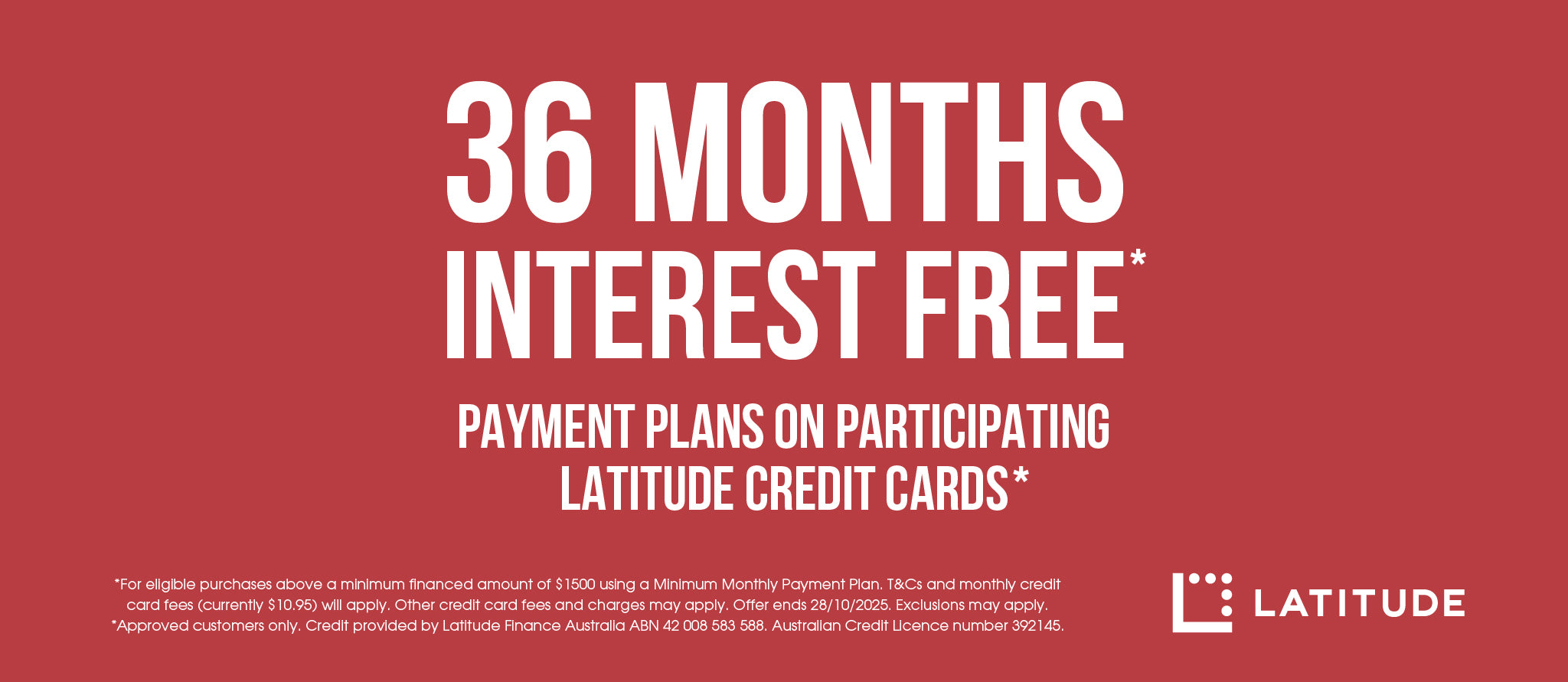 Also available on other participating Latitude credit cards.* For eligible purchases above a minimum financed amount using a Minimum Monthly Payment Plan. T&Cs & monthly credit card fee (currently $10.95) will apply. Other credit card fees and charges may apply. Exclusions may apply. *Approved customers only. Credit provided by Latitude Finance Australia ABN 42 008 583 588. Australian Credit Licence number 392145. See Terms & Conditions for more information.